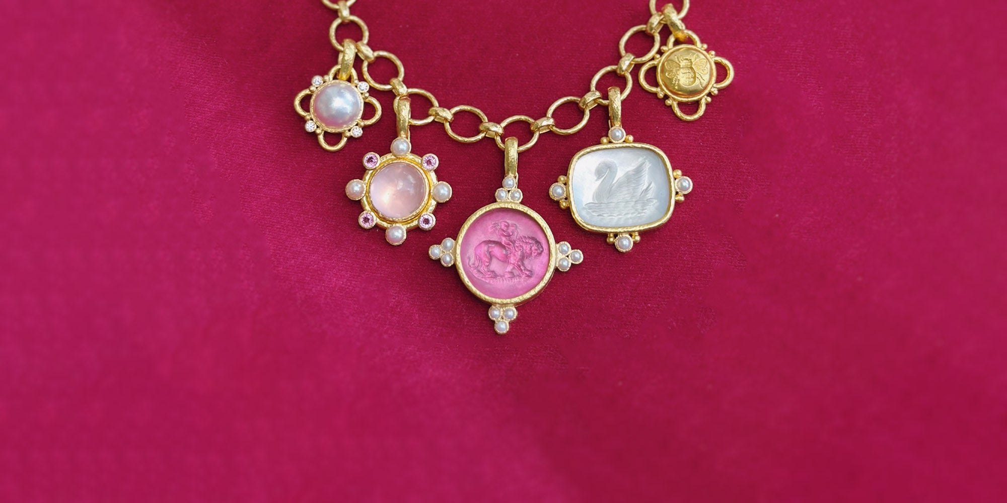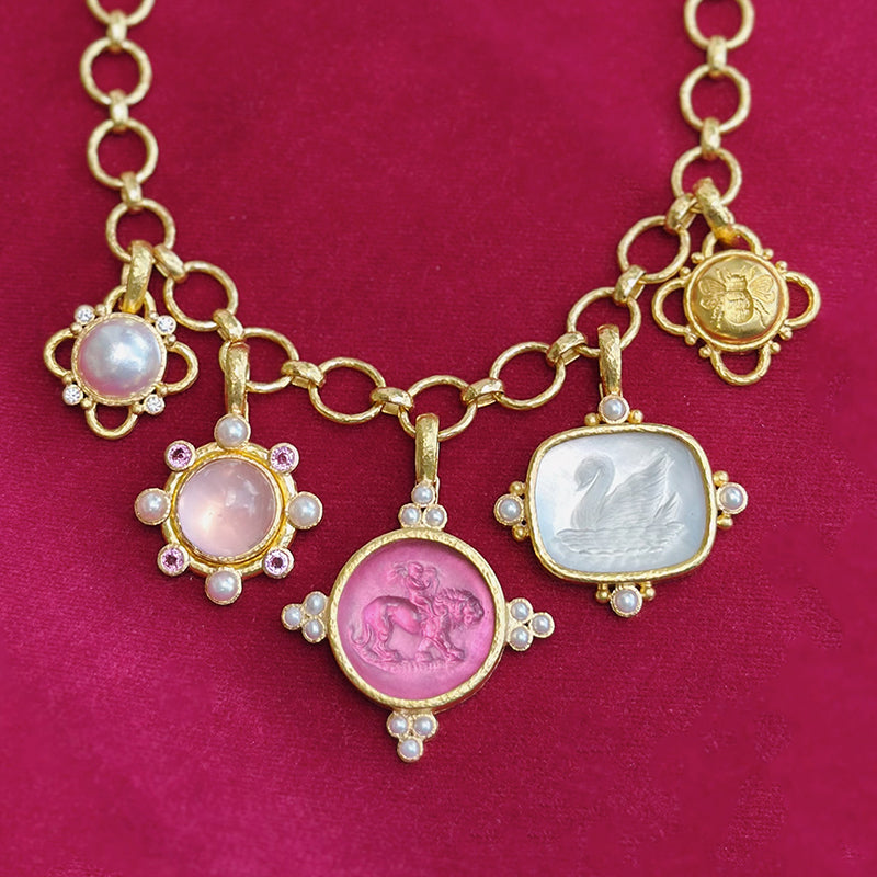 Necklaces featuring hand-selected antiquities, coins, porcelain, micromosaics, set in Elizabeth Locke’s signature 19k gold craftsmanship.