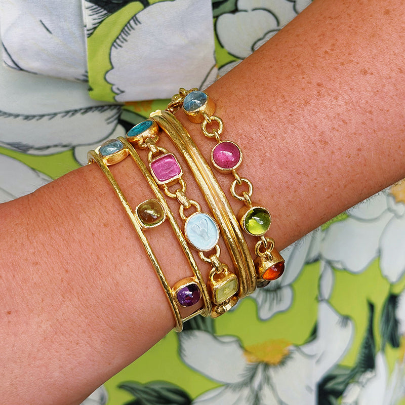 Bracelets crafted in hand-hammered 19k gold, set with antique micromosaics, intaglios, and one-of-a-kind historical elements sourced by Elizabeth Locke.