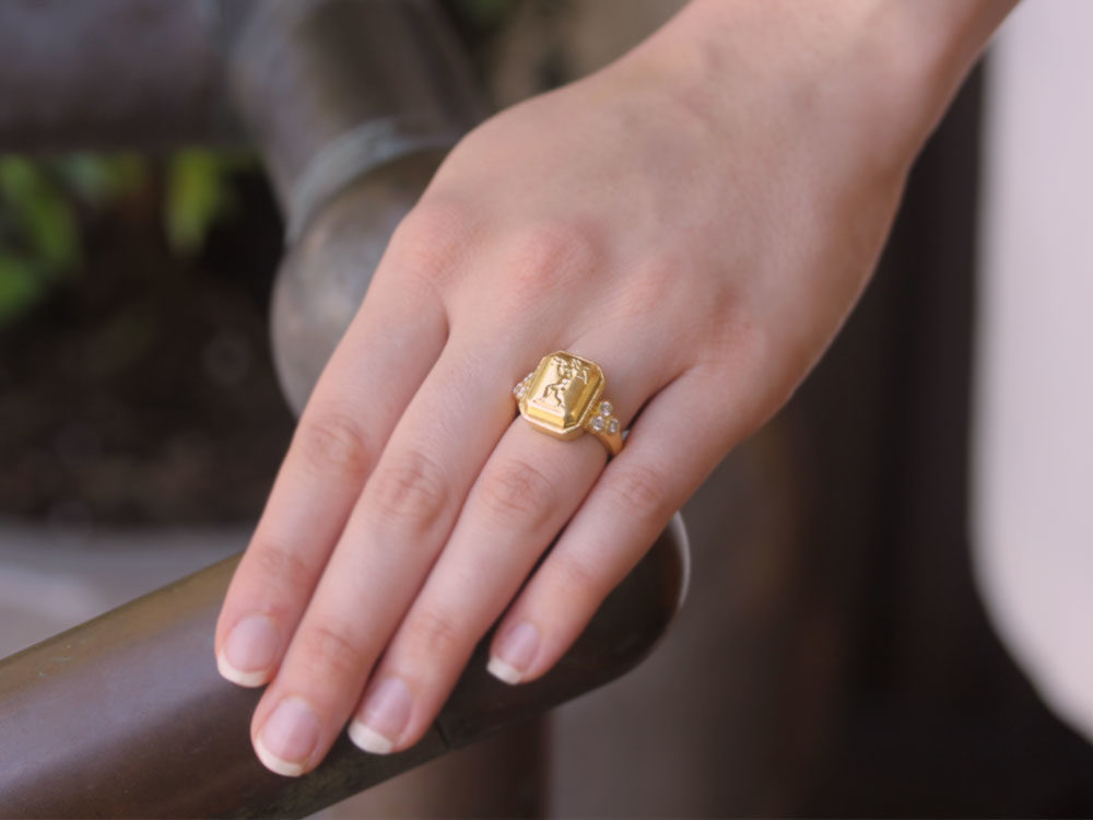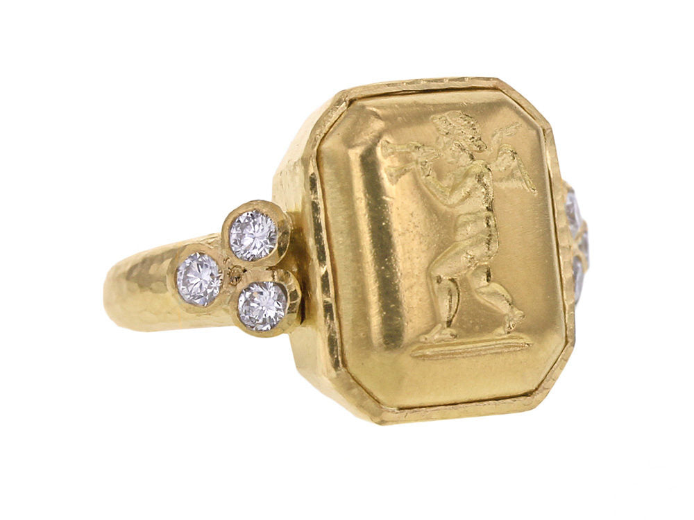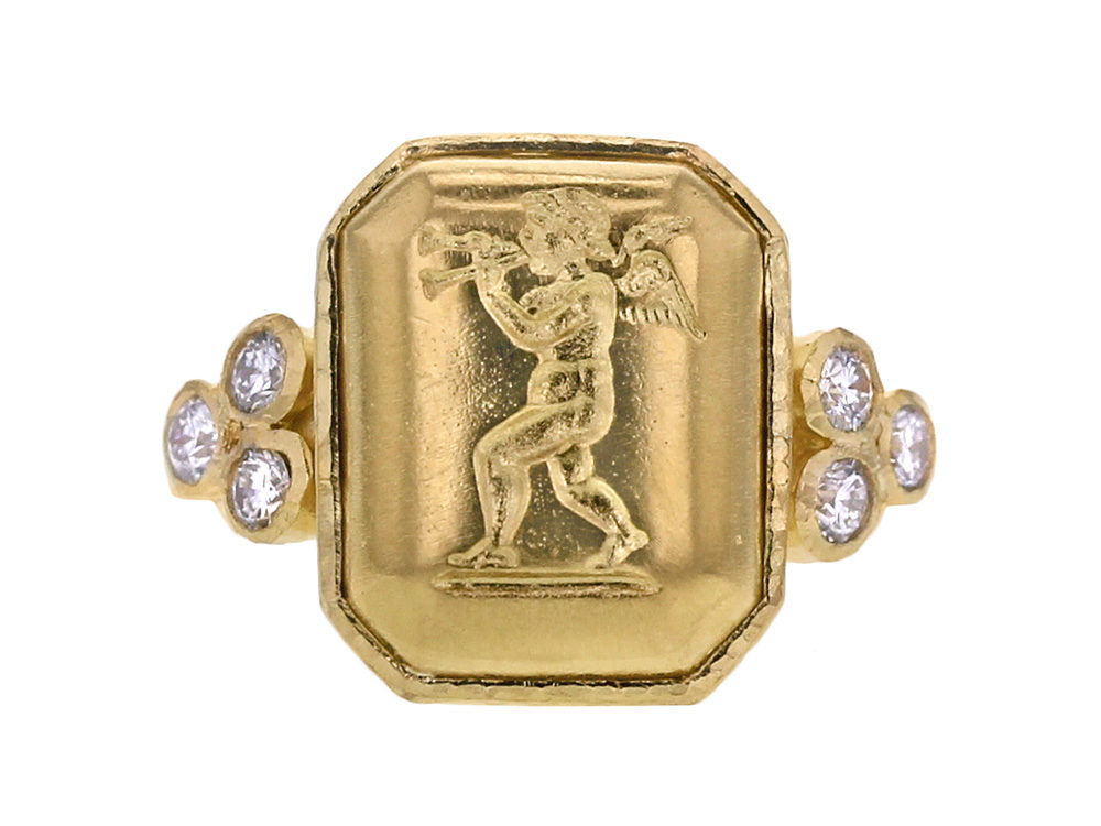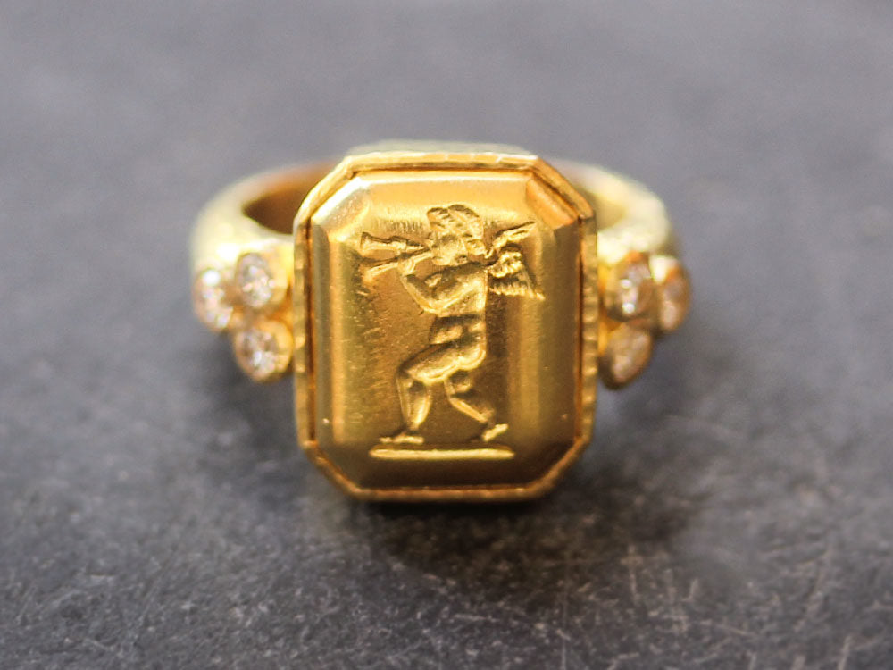 Octagonal Gold "Cherub with Flute" Ring with Diamonds Triads